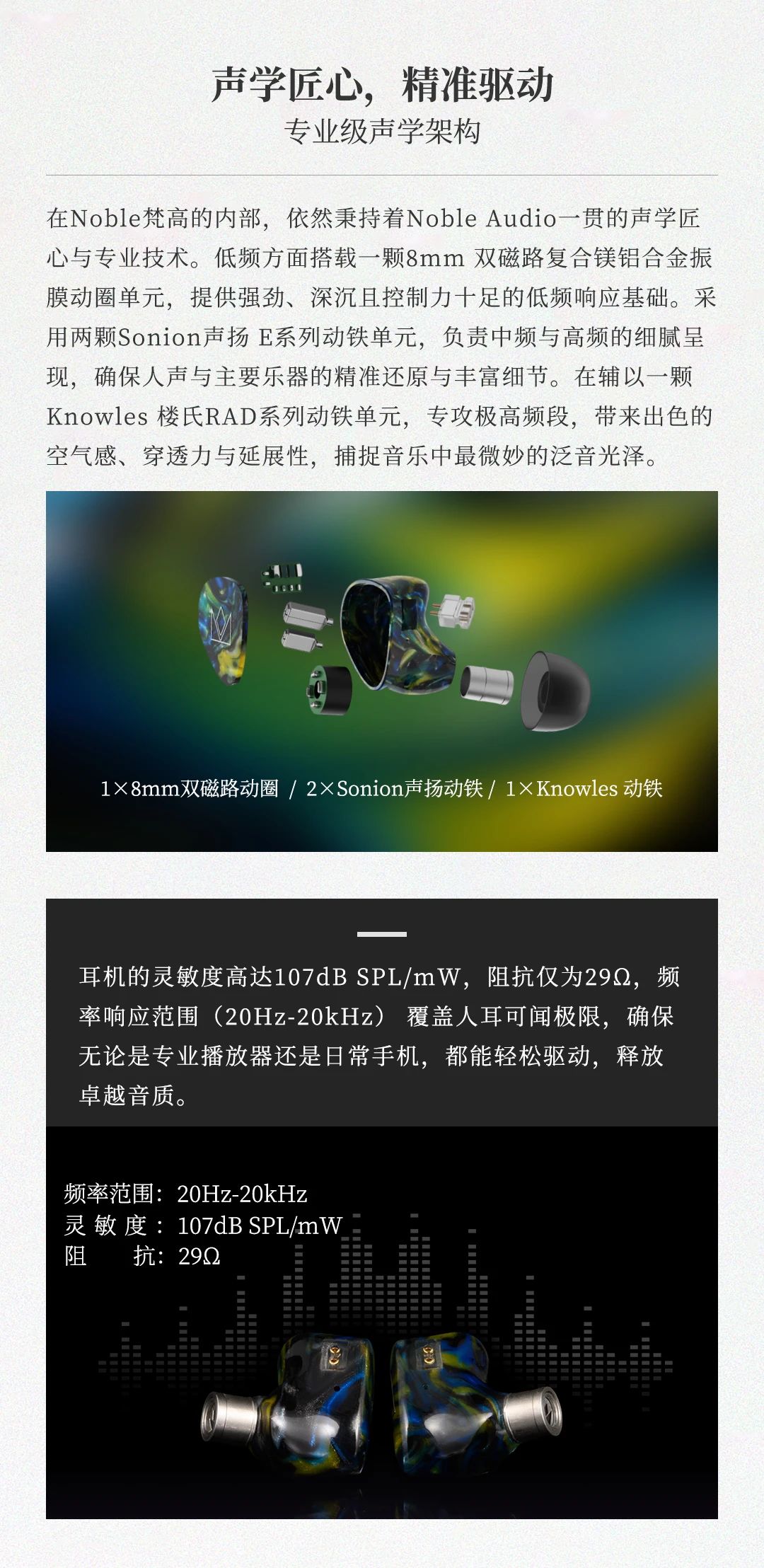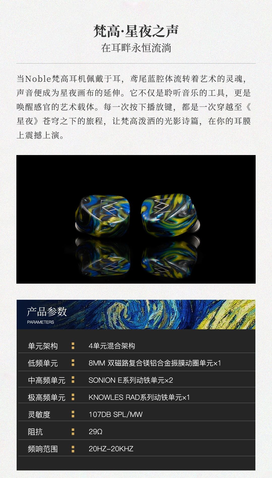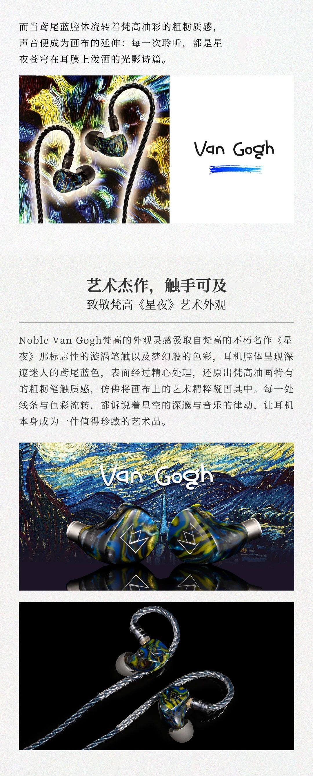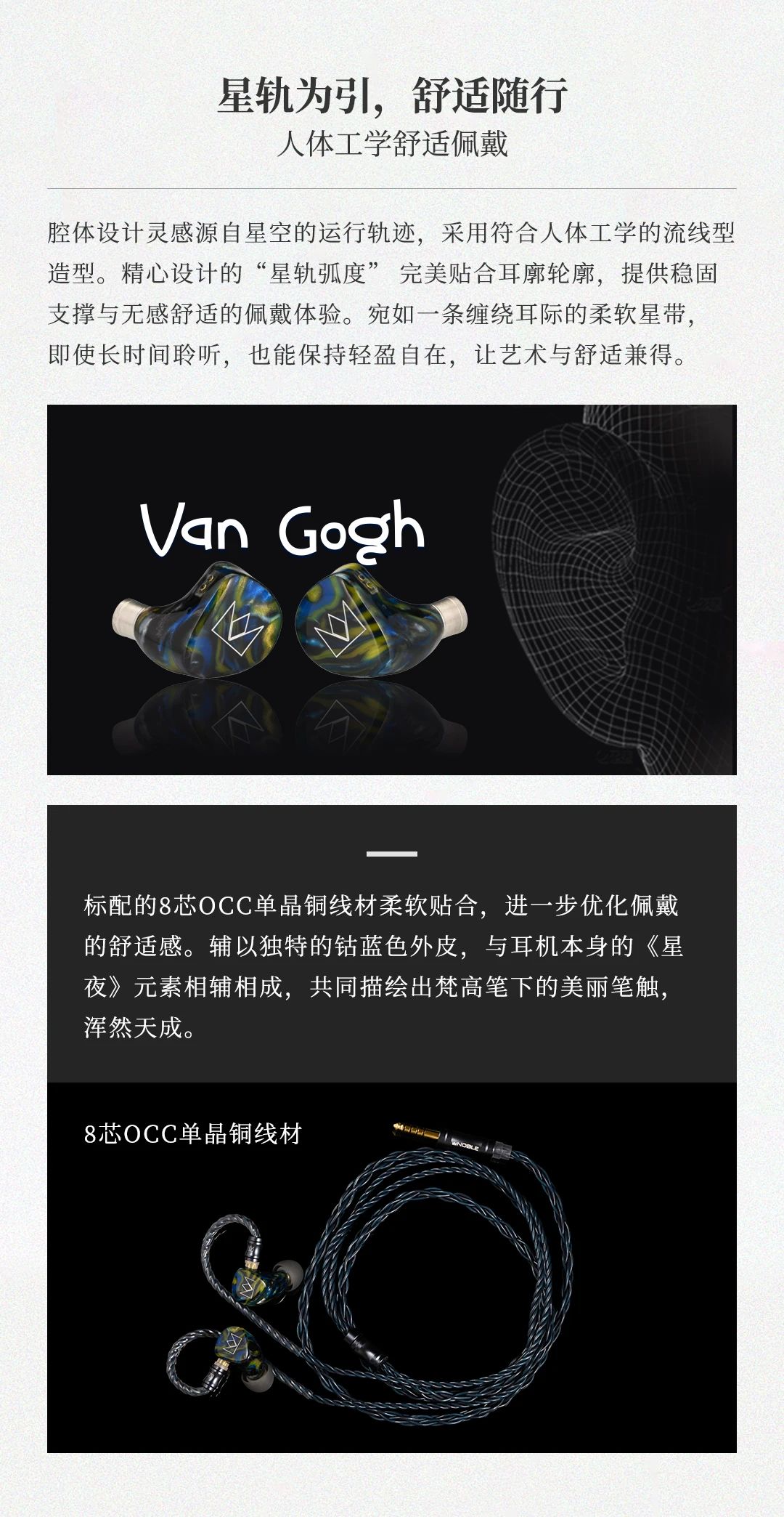 Van Gogh 梵高耳機(jī)以梵高名作《星夜》為靈感,將鳶尾藍(lán)腔體的粗糲油彩質(zhì)感與星空漩渦般的人體工學(xué)設(shè)計(jì)融合,打造可穿戴的藝術(shù)單品。聲學(xué)上采用 4 單元混合架構(gòu) ——8mm 雙磁路動(dòng)圈單元帶來如翻滾云浪的低頻律動(dòng),2 顆 Sonion 動(dòng)鐵單元精準(zhǔn)呈現(xiàn)中頻人聲的細(xì)膩情感,1 顆 Knowles 極高頻動(dòng)鐵單元演繹星光穿透薄霧般的高頻延展,三頻動(dòng)態(tài)對(duì)比鮮明如梵高筆觸,搭配 107dB 靈敏度與 29Ω 阻抗,手機(jī)直推即可釋放 20Hz-20kHz 全頻段鮮活聽感。星軌弧度腔體貼合耳廓,8 芯 OCC 單晶銅線材呼應(yīng)畫作元素,讓佩戴成為纏繞耳際的舒適星帶。
